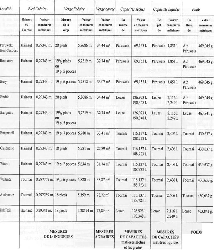 Brasménil, Callenelle, Wiers, Wasmes-Audemetz utilisaient les mesures de Tournai ; Baugnies, Braffe et Briffoeil, celles de Leuze ; Péruwelz ( + Bon-Secours), Bury et Roucourt celles de Péruwelz.
