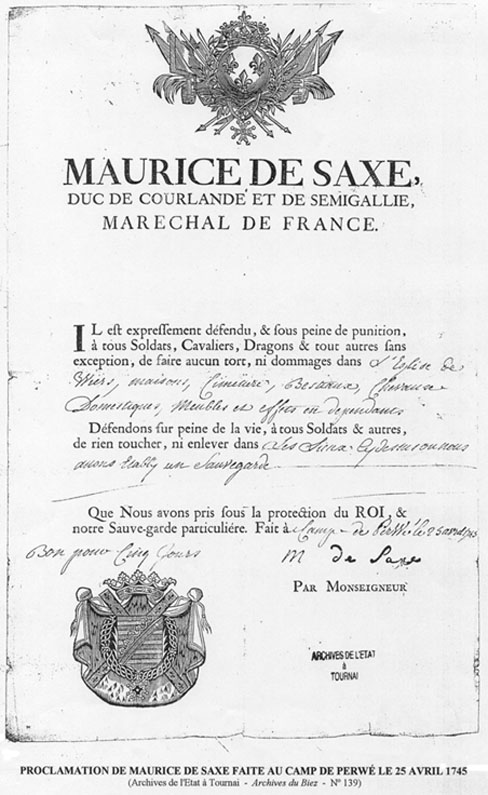 Il faut ici rendre hommage à Jules Renard qui publia en 1887 à la page 173 de son ouvrage Histoire de la commune de Wiers un document unique[6] : une proclamation de Maurice de Saxe[7].