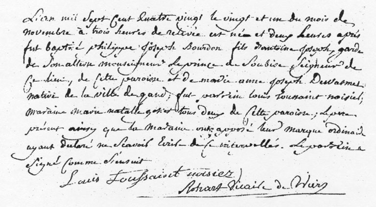 [13]Wiers-Baptêmes-Acte du 21 novembre 1780 : L'an mil sept cent quatre vingt le vingt et un du mois de novembre à trois heures de relevée est né et deux heures après fut baptisé philippe joseph Bourdon, fils d'Antoine Joseph Bourdon, garde de Son altesse monseigneur le prince de Soubise Seigneur de ce lieu, de cette paroisse et de marie anne joseph Dewasmes native de la ville de Gand, fut parrein Louis Toussaint Noisier ; marraine Marie natalie Gosset tous deux de cette paroisse.