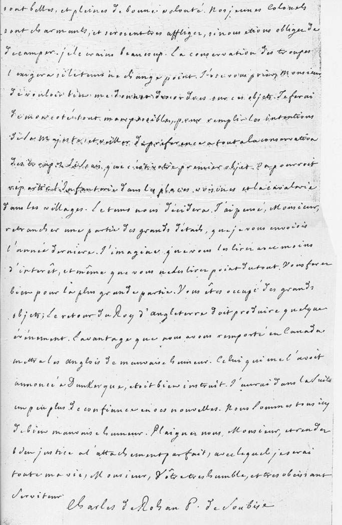 [1]Communication de Monsieur Denis Giguère, Archives Nationales du Québec, Centre d'Archives de la Capitale, 1210, avenue du Séminaire, CP10450 Sainte-Foy (Québec) G1V 4N1. Cette lettre est mentionnée ainsi que deux autres lettres du prince de Soubise dans "Etat général des archives publiques et privées du Québec", publié par le Ministère des Affaires cuturelles, 1968. 312 p. page 108